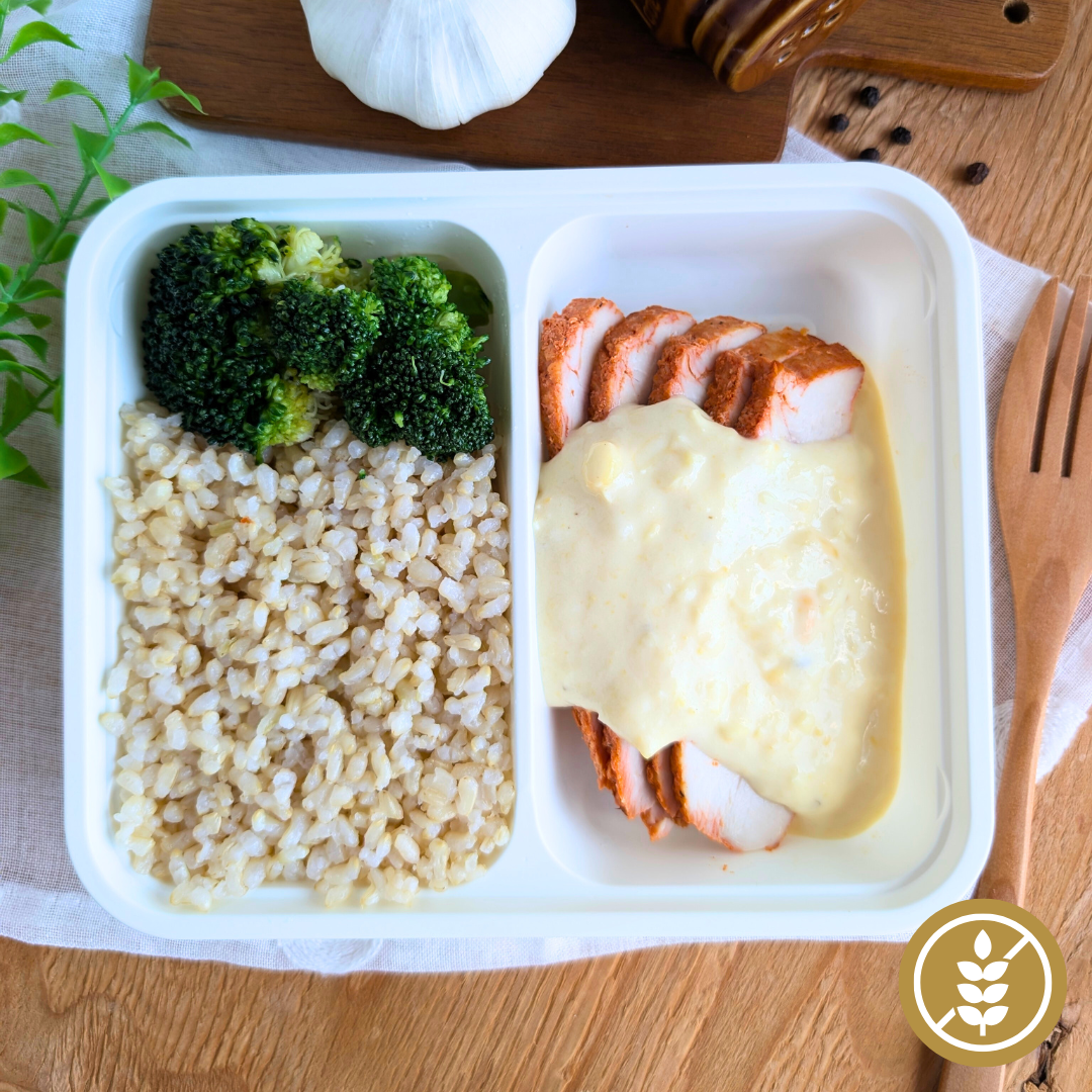 O peito de frango é marinado em especiarias naturais e assado em forno combinado, preservando a suculência e a leveza da carne. Fatiado delicadamente, recebe um creme de milho aveludado, preparado com temperos especiais e creme de leite, que realça a cremosidade e o conforto do prato.